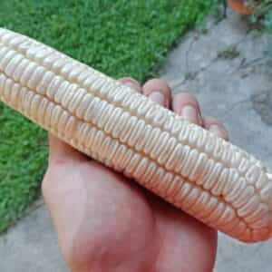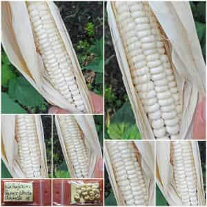Σπάνια παραδοσιακή ποικιλία από Άσπρο Καλαμπόκι Γίγας, το οποίο ξεχωρίζει για τους ευμεγέθεις λευκούς και πεπλατυσμένους σπόρους του. Η συγκεκριμένη ποικιλία δεν είναι γλυκιά στη γεύση της και δεν φέρει εμπορική αξία. Χρησιμοποιείται κυρίως για καλλωπιστικούς σκοπούς. Τα φυτά είναι πρώιμης ανάπτυξης, ενώ φτάνουν τα 2+ μέτρα σε ύψος και αγαπούν τα ανοιχτά μέρη για καλλιέργεια με πλήρη ηλιοφάνεια. Δηλαδή, δεν συνίσταται η ανάπτυξή τους σε σκιερά ή ημισκιερά μέρη και σε μέρη κάτω από δέντρα. Είναι σχετικά εύκολη η καλλιέργεια της συγκεκριμένης ποικιλίας, αφού το μόνο που επιζητά είναι τακτικό πότισμα και πλήρη ηλιοφάνεια, ενώ επάνω σε κάθε φυτό σχηματίζει συνήθως 1-2 λοβούς. Η σπορά συνίσταται να γίνεται κυρίως αρχές της άνοιξης (αρχές Μαρτίου έως Μάιο) ή απευθείας στη γη ή σε κυπελλάκια και ύστερα μεταφύτευση στη γη. Η μεταφύτευση θα πρέπει να γίνεται άμεσα και αραιά (περίπου 70-80 εκατοστά μεταξύ των ριζών), μόλις τα φυτά αναπτυχθούν στα 5-6 εκατοστά σε ύψος. Τα παρακλάδια που μπορεί να βγάζει από τον κορμό συνίσταται να κόβονται για να εστιάσει την ενέργεια του το φυτό στον κεντρικό κορμό και να δέσει καρπό. Το Καλαμπόκι Άσπρο Γίγας αποτελεί μια εντυπωσιακή ποικιλία και σίγουρα απευθύνεται σε συλλέκτες, αλλά και σε όσους αναζητούν και καλλιεργούν σπάνιες παραδοσιακές ποικιλίες καλαμποκιών.