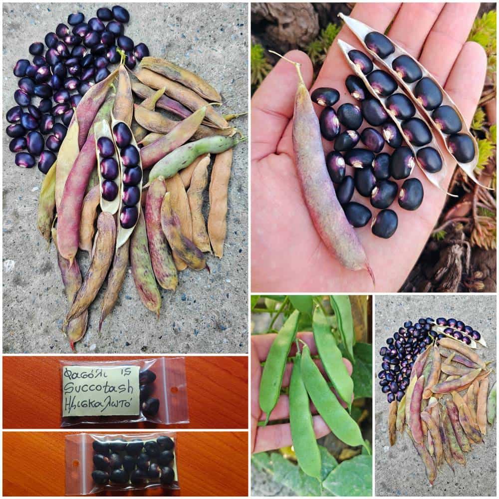 Σπάνια παραδοσιακή ποικιλία από ημιαναρριχώμενο φασόλι, το οποίο είναι γνωστό με την ονομασία ”Succotash”. Λέγεται ότι το αρχαίο αυτό φασόλι συνδέεται με την φυλή ”Narragansett” του Rhode Island στην Αμερική. Αυτό το μοναδικού σχήματος φασόλι μοιάζει πολύ με πυρήνα καλαμποκιού, αφού οι σπόροι μοιάζουν σαν να είναι από ποικιλία ευμεγέθους παραδοσιακού καλαμποκιού. Αυτή η ποικιλία χρησιμοποιούνταν για το ”Succotash”, δηλαδή το εμβληματικό φαγητό με καλαμπόκι και φασόλια που οι ιστορικοί πιστεύουν ότι σερβίρονταν στην πρώτη Ημέρα των Ευχαριστιών. Εξού, λοιπόν, και η ονομασία του. Η συγκεκριμένη ποικιλία ξεχωρίζει για τους πανέμορφους μαύρους σπόρους της, οι οποίοι φέρουν μωβ αποχρώσεις μόλις γίνεται η συγκομιδή. Καλλιεργείται κυρίως ως ξηρό φασόλι, ενώ φέρει ζήτηση από συλλέκτες σπάνιων ποικιλιών φασολιών. Η ποικιλία αυτή χρειάζεται στηρίγματα, ενώ το ύψος της φτάνει γύρω στο 1 με 1,5 μέτρο. Τα φυτά είναι πολύ παραγωγικά, οι καρποί ξεκινούν ως πράσινοι και όσο ωριμάζουν, αλλάζουν χρωματισμούς. Η καλλιέργεια τους είναι καλό να γίνεται αρχές της άνοιξης (αρχές Μαρτίου έως Μάιο), αλλά και τέλη καλοκαιριού με αρχές φθινοπώρου (μέσα Αυγούστου έως τέλη Σεπτεμβρίου). Συνίσταται σπορά σε κυπελλάκια και ύστερα μεταφύτευση στη γη, έτσι ώστε να μεγιστοποιηθεί η βλαστικότητα. Η μεταφύτευση θα πρέπει να γίνεται άμεσα, μόλις αναπτυχθούν τα πρώτα δύο φύλλα. Σε ένα καλάμι είναι καλό να φυτευτούν 3 ρίζες περιμετρικά, όχι περισσότερες για να μπορέσουν τα φυτά να παράγουν στο μέγιστο. Το ημισκαλωτό Φασόλι ”Succotash” είναι μια ιδιαίτερη ποικιλία και απευθύνεται κυρίως σε όσους αναζητούν και καλλιεργούν σπάνιες παραδοσιακές ποικιλίες φασολιών. Περιορισμένη διαθεσιμότητα.