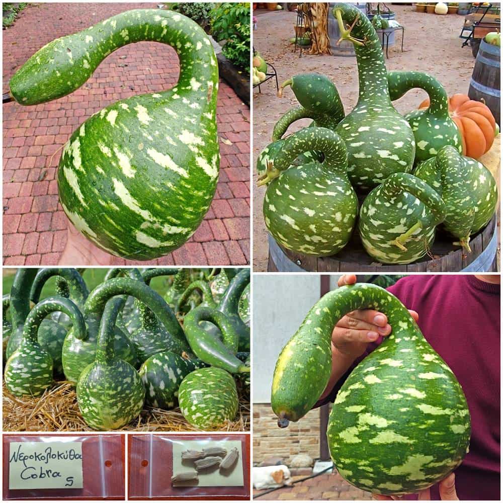 Σπάνια παραδοσιακή ποικιλία από Νεροκολοκύθα, η οποία είναι γνωστή με την ονομασία ”Cobra” ή Snake Gourd ”Cobra”. Η συγκεκριμένη ποικιλία αποτελεί ένα εντυπωσιακό και ιδιόμορφο είδος κολοκύθας, που ξεχωρίζει για τον ιδιαίτερο καρπό της, ο οποίος έχει μακρύ, καμπυλωτό σχήμα και μοιάζει με φίδι ή κόμπρα, χαρακτηριστικό που της χάρισε και το όνομά της. Πρόκειται για ετήσιο φυτό αναρριχώμενο, το οποίο μπορεί να φτάσει σε μήκος αρκετά μέτρα και αναπτύσσεται σε φράχτες, σκαλωσιές ή στηρίγματα, καλύπτοντας γρήγορα μεγάλες επιφάνειες με το πλούσιο φύλλωμά του. Ωστόσο, μπορεί να καλλιεργηθεί και να απλώσει στη γη χωρίς σκαλωσιές. Οι καρποί φέρουν πράσινο χρώμα με ραβδώσεις ή κηλίδες, ενώ το μήκος τους κυμαίνεται μεταξύ 35 – 60 εκατοστών, ενώ σε περιπτώσεις μπορούν να φτάσουν και το 1 μέτρο. Εκτός από το διακοσμητικό ενδιαφέρον, η νεροκολοκύθα χρησιμοποιείται και γαστρονομικά σε πολλές κουζίνες της Ασίας, καθώς οι τρυφεροί νεαροί καρποί είναι βρώσιμοι και καταναλώνονται μαγειρεμένοι σε σούπες, τηγανιτές ή γεμιστές συνταγές. Ευδοκιμεί σε θερμά κλίματα, σε πλούσια, καλά στραγγιζόμενα εδάφη και χρειάζεται αρκετό ήλιο και υγρασία για σωστή ανάπτυξη. Συνίσταται σπορά αρχικά σε κυπελάκια και ύστερα μεταφύτευση, για την καλύτερη διαχείριση των φυτών και σπόρων. Η Νεροκολοκύθα ”Cobra” καλλιεργείται συχνά για διακοσμητικούς σκοπούς, καθώς οι ιδιαίτεροι καρποί της προσθέτουν εξωτική και θεαματική όψη σε κήπους, εκθέσεις ή συνθέσεις.