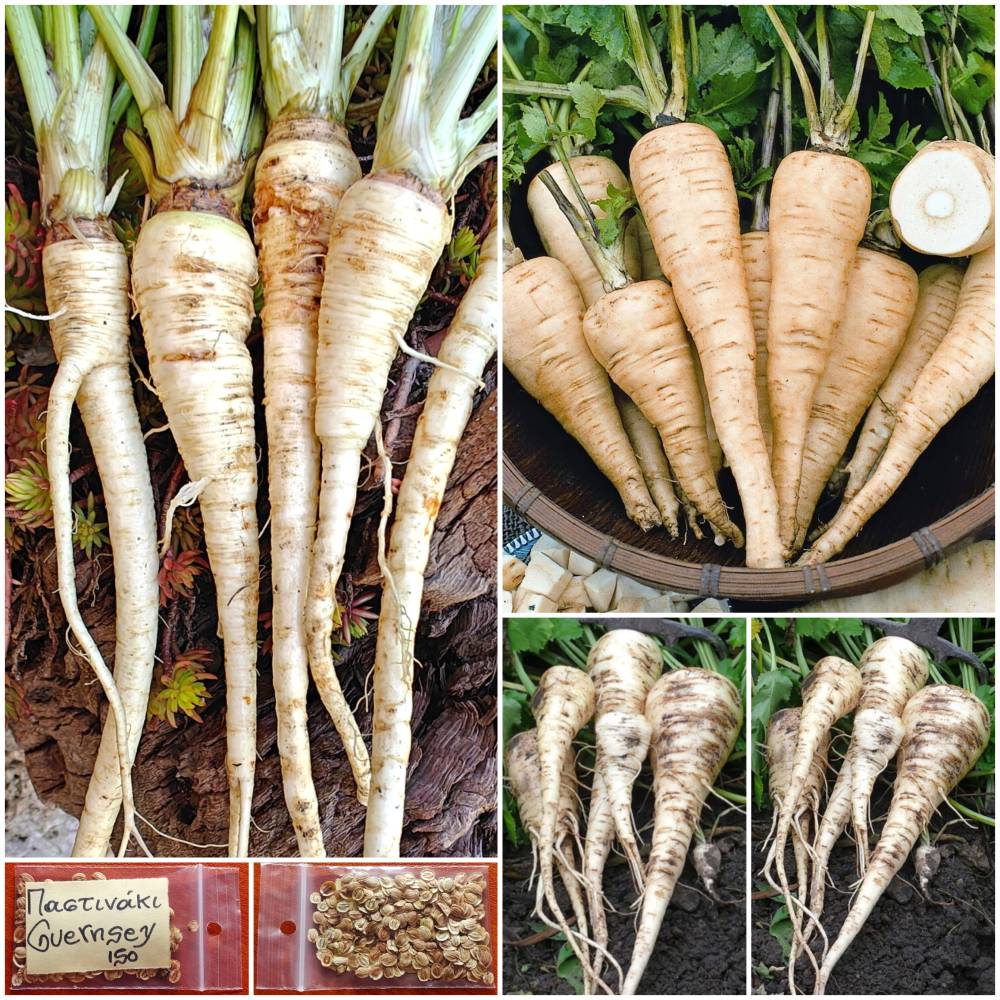 Παραδοσιακή ποικιλία από Παστινάκι, το οποίο είναι γνωστό με την ονομασία ”Guernsey”. Η συγκεκριμένη ποικιλία διακρίνεται για την ανάπτυξη εύρωστων και υγιών φυτών, παρουσιάζοντας αξιοπιστία στην καλλιέργεια και συνέπεια στην απόδοσή της. Οι ρίζες είναι λευκές και επιμήκεις, με σχήμα που θυμίζει καρότο, ενώ η γεύση τους παραπέμπει σε σέλινο και μαϊντανό, προσφέροντας ένα ιδιαίτερα αρωματικό και γλυκό προφίλ. Πρόκειται για ένα ιδιαίτερα πολύτιμο λαχανικό, με υψηλή περιεκτικότητα σε κάλιο, το οποίο μπορεί να καταναλωθεί φρέσκο, βραστό, στον ατμό ή και τηγανητό, καλύπτοντας ένα ευρύ φάσμα γαστρονομικών χρήσεων. Οι σπόροι βλασταίνουν αργά, επομένως συνίσταται υπομονή. Οι ρίζες αντέχουν τις χαμηλές θερμοκρασίες και μπορούν να παραμείνουν κάτω από το χιόνι τον χειμώνα. Μπορεί να καλλιεργηθεί τόσο την άνοιξη, όσο και το φθινόπωρο, ωστόσο εμείς συνιστούμε την φύτευσή του μαζί με όλα τα φθινοπωρινά, για την καλύτερη διαχείριση, παράταση και απόδοση της καλλιέργειας. Η σπορά μπορεί να γίνει απευθείας στη γη και σε ύστερη φάση να γίνει αραίωση, εάν χρειάζεται. Μπορεί, όμως, να γίνει σπορά και σε κυπελάκια αραιά και ύστερα να γίνει μεταφύτευση στη γη. Μετά την συγκομιδή φέρει υψηλή διατηρησιμότητα. Καλλιεργείται κυρίως για τις ρίζες του και όχι για το φύλλωμά του. Αναπτύσσει λευκές, σαρκώδεις ρίζες με λεία επιφάνεια και μήκος περίπου 20–25 εκατοστά. Η σάρκα του είναι απαλή, γλυκιά και ιδιαίτερα αρωματική. Η γεύση του ενισχύεται μετά τις πρώτες φθινοπωρινές δροσιές, καθώς τότε τα φυσικά σάκχαρα αρχίζουν να συγκεντρώνονται σε μεγαλύτερη περιεκτικότητα στη ρίζα. Είναι κατάλληλη για υπαίθρια καλλιέργεια, προσαρμόζεται σε διάφορους τύπους εδαφών και έχει καλή αντοχή στο ψύχος, γεγονός που την καθιστά ιδανική για χειμερινή συγκομιδή και αποθήκευση. Καταναλώνεται βραστή, ψητή, σε πουρέ ή σούπες, προσφέροντας μια νόστιμη και θρεπτική εναλλακτική στο καρότο ή την πατάτα. Το Παστινάκι ”Guernsey” είναι μια κλασική, αποδεδειγμένα παραγωγική ποικιλία, ιδιαίτερα αγαπητή τόσο σε οικιακούς κήπους όσο και σε παραδοσιακές αγορές.