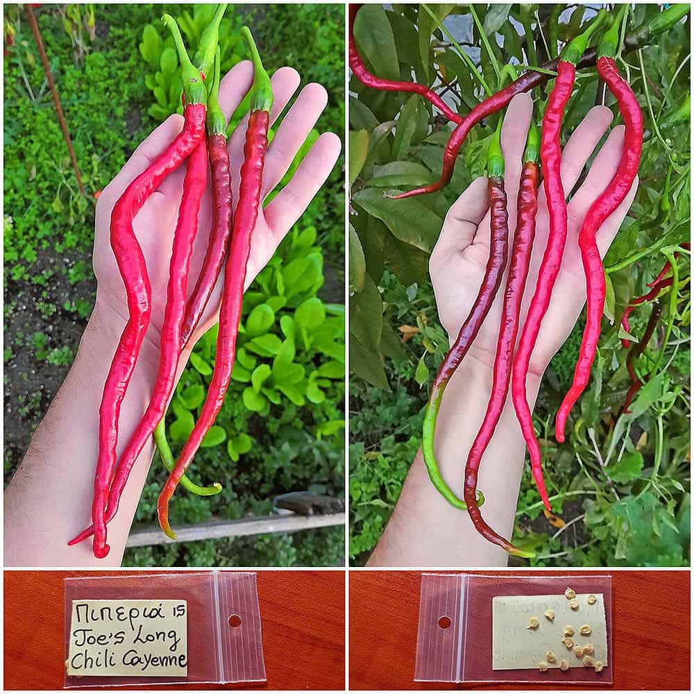 Εξαιρετικά σπάνια παραδοσιακή ποικιλία πιπεριάς τσίλι που εντυπωσιάζει. Είναι γνωστή με την ονομασία ”Joe’s Long Chili Cayenne” και στην ουσία πρόκειται για ποικιλία τύπου τσίλι καγιέν αλλά είναι γιγαντιαία σε μέγεθος καρπών. Το φυτό είναι εύρωστο, αναπτύσσεται στο 1,5 μέτρο συνήθως σε ύψος και χρειάζεται στηρίγματα. Η ποικιλία αυτή είναι πλούσια σε παραγωγή, με τους καρπούς να ξεκινούν ως πράσινοι και καθώς ωριμάζουν να παίρνουν ολοένα και πιο έντονο κόκκινο χρώμα. Οι φωτογραφίες μιλούν από μόνες τους και είμαστε σίγουροι ότι μόλις την καλλιεργήσετε και εσείς, θα εντυπωσιάσετε αρκετό κόσμο με τη συγκεκριμένη ποικιλία. Η συγκεκριμένη ποικιλία σίγουρα δεν περνά απαρατήρητη στον κήπο.