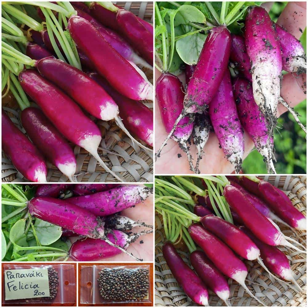 Σπάνια παραδοσιακή ποικιλία από δίχρωμο επίμηκες Ραπανάκι, το οποίο είναι γνωστό με την ονομασία ”Felicia”. Η συγκεκριμένη ποικιλία είναι αρκετά πρώιμη και ξεχωρίζει για τους μακρόστενους καρπούς της. Εξωτερικά κυριαρχούν οι μωβ και λευκές αποχρώσεις, ενώ εσωτερικά, τα κεφάλια φέρουν τραγανή υφή και λευκή σάρκα. Η συγκεκριμένη ποικιλία μπορεί να καλλιεργηθεί δυο φορές τον χρόνο, την άνοιξη και το φθινόπωρο, τόσο υπαίθρια όσο και σε θερμοκήπιο. Καλλιεργείται με μεγάλη ευκολία κατά τις δροσερές εποχές και προσφέρει γρήγορη συγκομιδή, περίπου 32–37 ημέρες μετά τη σπορά. Χαρακτηρίζεται από ήπια, ευχάριστη γεύση, καθώς και από ομοιομορφία και σταθερότητα στην παραγωγή. Τα παραπάνω στοιχεία το καθιστούν ιδανική επιλογή για φρέσκια κατανάλωση και για χρήση σε σαλάτες. Η βέλτιστη θερμοκρασία ανάπτυξης της συγκεκριμένης ποικιλίας είναι μεταξύ 15 – 20 βαθμών Κελσίου. Οι χαμηλότερες θερμοκρασίες δεν αποτελούν απειλή, ωστόσο η βλάστηση και η ανάπτυξη των φυτών επιβραδύνονται. Συνίσταται η καλλιέργεια σε ανοιχτά μέρη με πλήρη ηλιοφάνεια. Η σπορά μπορεί να γίνει απευθείας στη γη και σε ύστερη φάση να γίνει αραίωση, εάν αυτό χρειαστεί. Μπορεί, όμως, να γίνει σπορά και σε κυπελάκια και ύστερα να γίνει μεταφύτευση στη γη. Η ιδανική απόσταση μεταξύ των ριζών είναι γύρω στα 5-10 εκατοστά, έτσι ώστε τα φυτά να αναπτυχθούν πλήρως και να σχηματίσουν ευμεγέθεις καρπούς. Το Ραπανάκι ”Felicia” αποτελεί ποικιλία ταχείας ανάπτυξης, ιδανική για υπαίθρια ή θερμοκηπιακή καλλιέργεια, κατά την άνοιξη, αλλά και το φθινόπωρο.